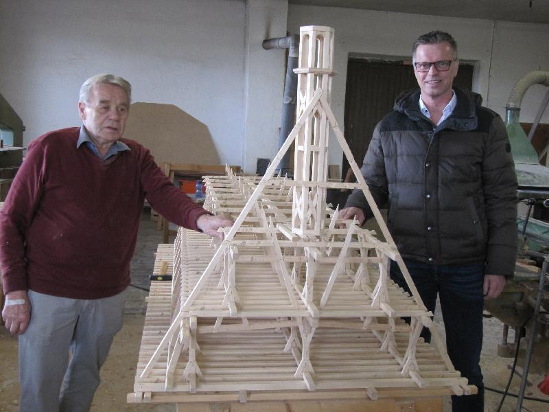 Hirschau (Bericht von Gerhard Fleischmann) Es ist ein Kunstwerk, was derzeit unter den geschickten HĂ€nden des 82-jĂ€hrigen Schreinermeisters Josef Hauer entsteht. Als 33sigster historischer Dachstuhlnachbau entsteht in seiner ehemaligen Schreinerei in Parkstein ein Nachbau des Dachstuhls des Hirschauer Rathauses, der im Jahr 1490 gefertigt wurde und in seiner Art einmalig in der Oberpfalz ist. Gefertigt wird das Holzmodell wie das Original, verbunden nur mit HolznĂ€geln und Zapfenverbindungen wie es im 15. Jahrhundert auch geschah. 1.BĂŒrgermeister Hermann Falk lieĂ es sich nicht nehmen sich das Modell, das derzeit zusammengebaut wird, anzusehen. Falk zeigte sich begeistert von dem Kunstwerk, ab Sommer soll das Modell im Hirschauer Rathaus prĂ€sentiert werden.